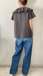 胸当てのあるボトムスにピッタリのブラウスになっております。