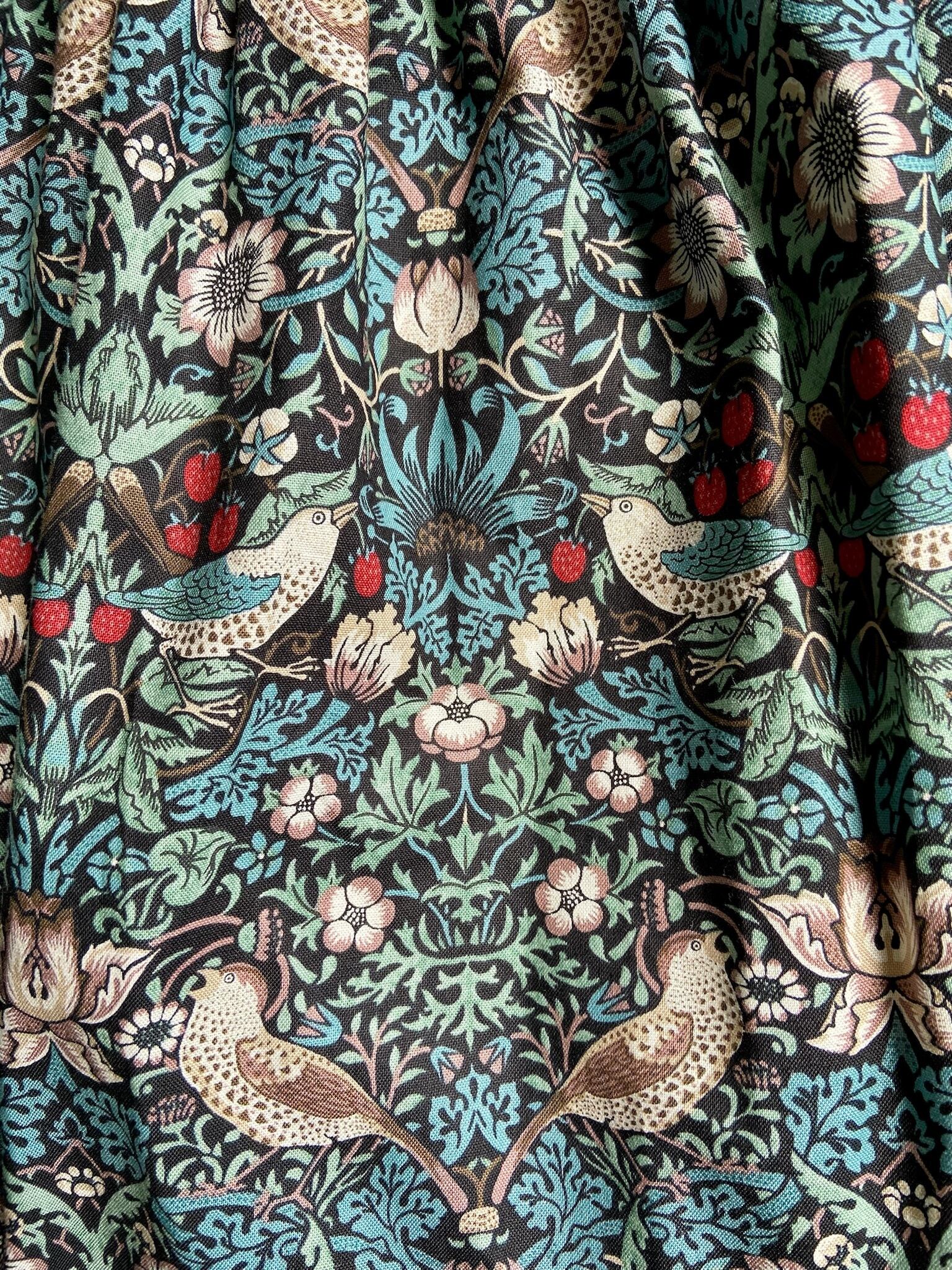 『いちご泥棒』は、モリスが赤や黄色をインディゴ抜染による藍に組み合わせた、最初のテキスタイルとなりました。 試行錯誤の結果、各色を個別に染め、刷り、抜くという高度なプリント技法が生み出されました。 プリント工程全体の完了に比較的日数を要するこのファブリックは、モリス商会が扱う木綿プリントの中では最も高価なものの一つに数えられましたが、その甲斐あってモリス商会において最も人気の高いパターンの一つとなり、現在に至るまでその人気を誇り続けています。 またこの作品には、『本当は種類の異なる鳥であったところを、ツグミに替えてデザインした』という説と、『イチゴをついばみに来たムクドリを描いた』という説があるそうです。