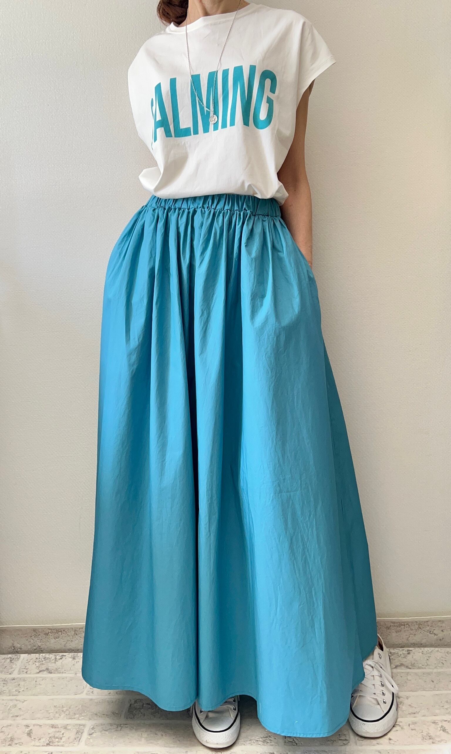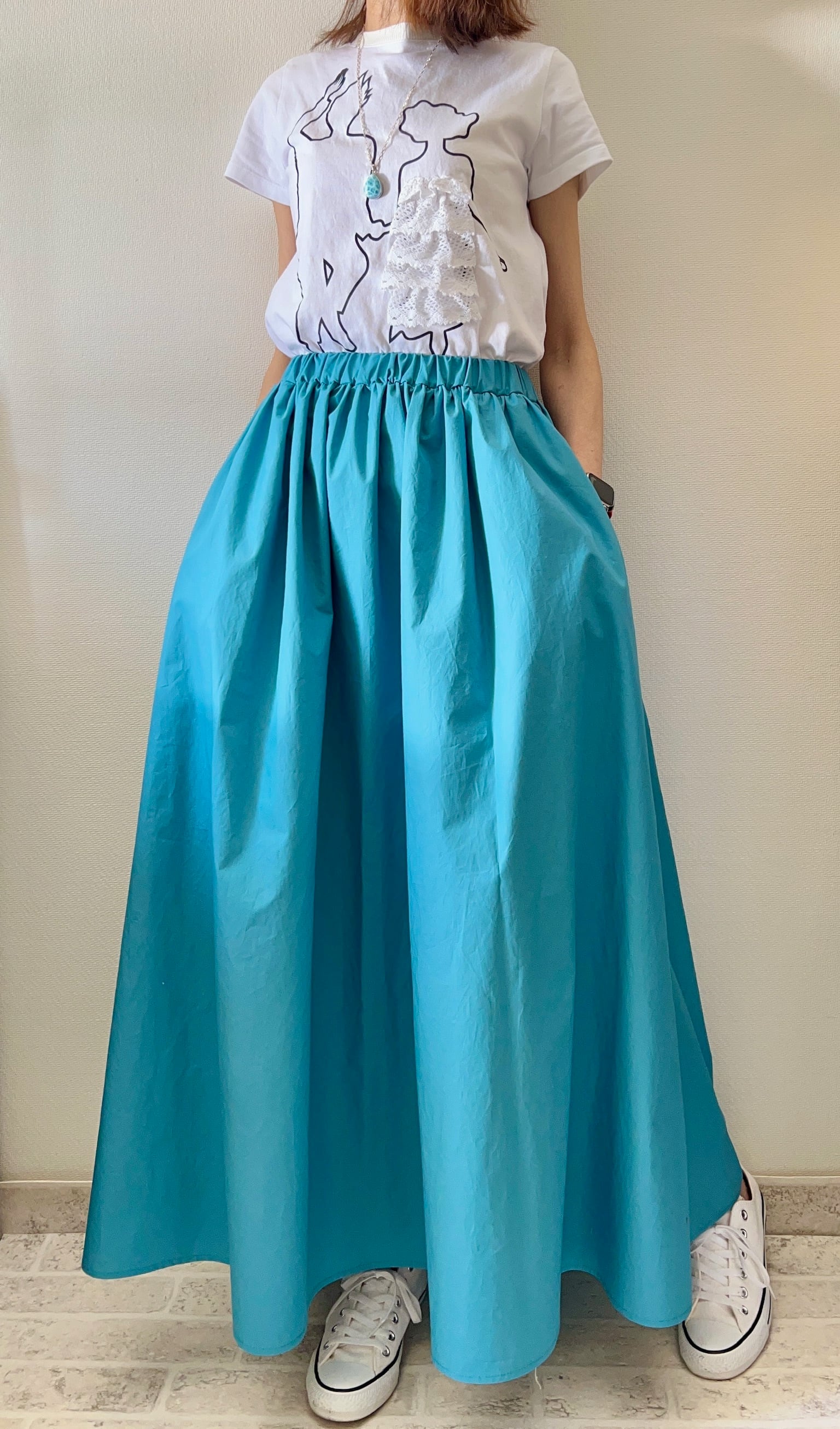 スカート丈はマキシ丈でスニーカーやサンダル合わせがイチオシですが、足捌きの良さを求める方はくるぶし上数センチあった方がいいです。