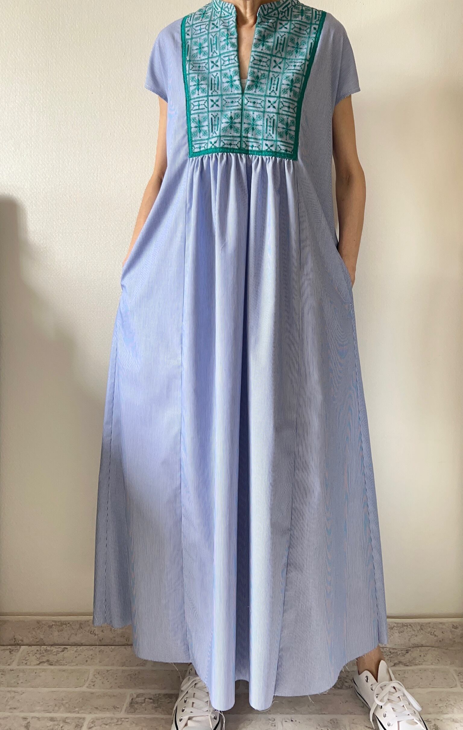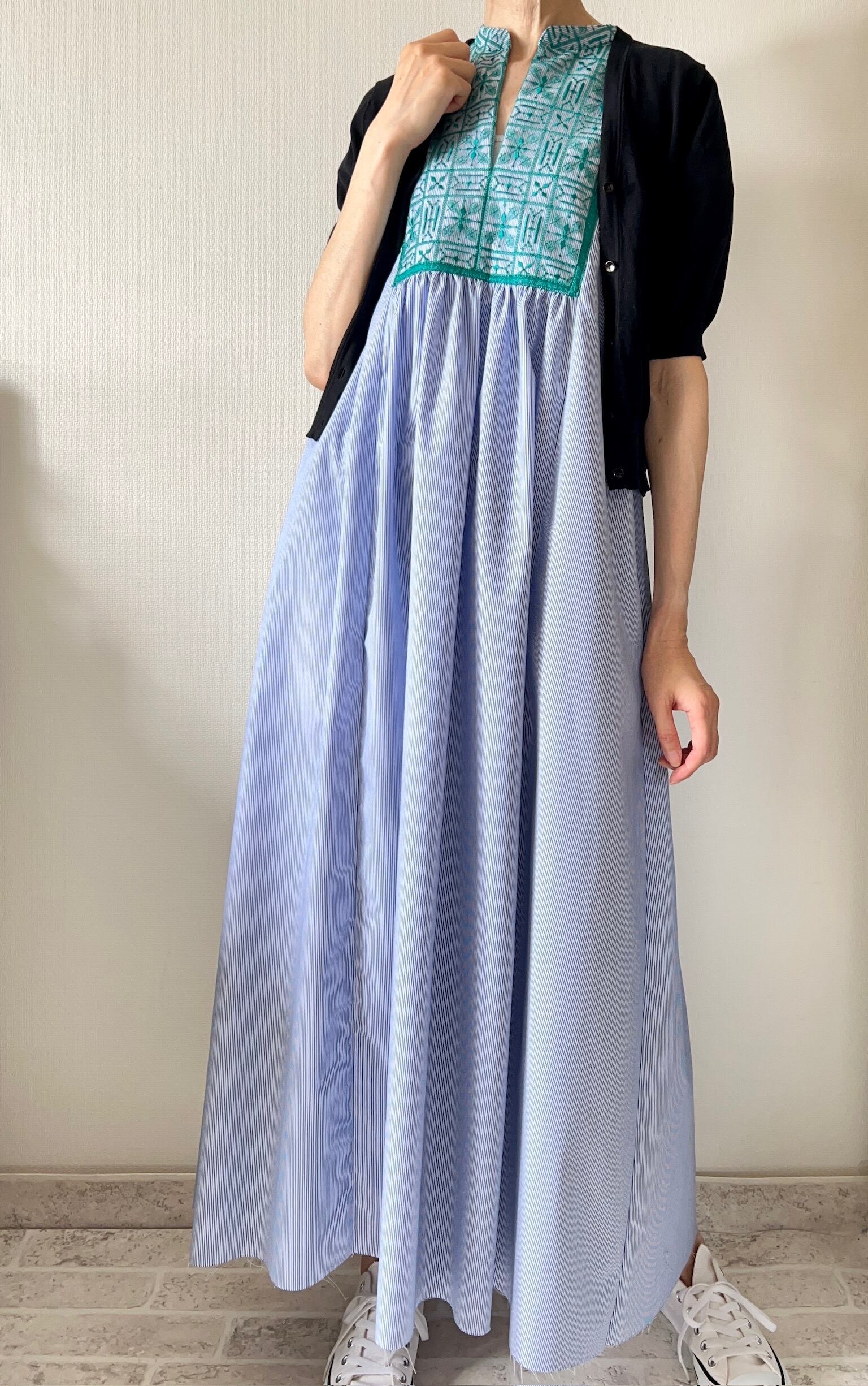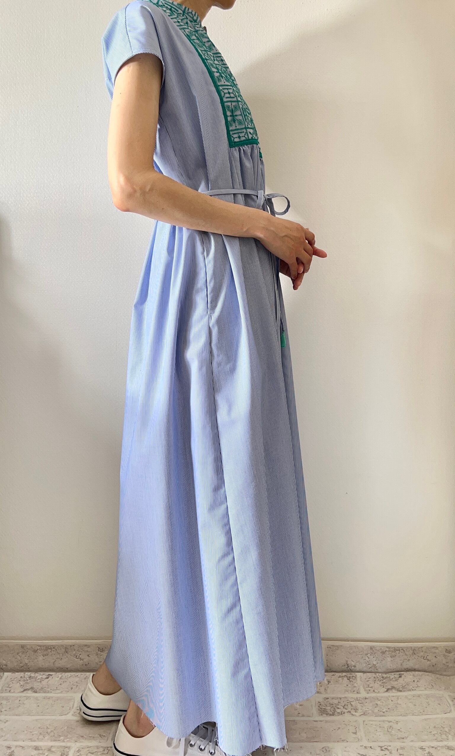 爽やかなブルー系のストライプにグリーンのナイロンシャーレースを合わせたとても夏らしいワンピースです。