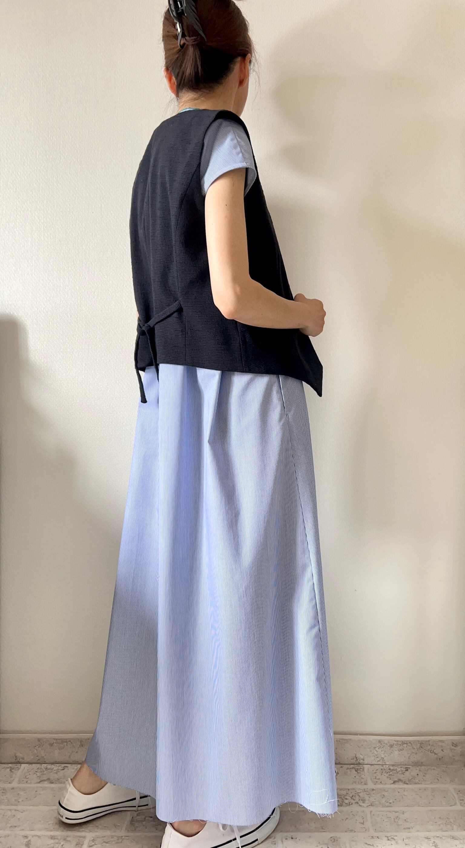 ウエストは絞らずゆったりもよし、タッセル付きの紐でちょっと絞るもよし、2通りの着こなしが楽しめます。